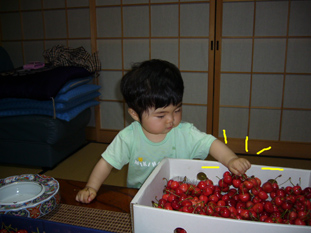 夕方、青森のばあば(ママの母)から荷物が到着中身は、わかってはいたけど・・・まさか・・・こんな量とは・・・(ーー;)ダンボール二つに、こんなに。。。食べきれないよ~・・・どうしよ・・・・・・・(ーー;)ネブタン、サクランボさんと初対面「赤いのたくしゃんで嬉ちいな~」「何だこれ~ 甘い匂いがしゅるよ」「これおもちろいね~ 何ちて遊ぼ~」サクランボを次々つかんで、遊んでます。サクランボは、鮮度が落ちやすく、しかも雨にあたると、すぐ割れて駄目になってしまうの今年は、天気が悪く、雨ばかりで特に痛みやすいみたい傷む前に早く早く、食べなきゃ・・・(ーー;)夕飯前に、ご近所や親戚に早めにお裾分け「ネブタンも仕分けのお手伝いでしゅ ん?・・・いらないんでしゅか!?」じいじと一緒に、ご近所へ青森のサクランボお裾分けでもネブタンには、サクランボお裾分け無いでちたよお裾分けで、何とか少し減らして、ママたちは、完熟のすごい 甘い 甘い サクランボを,たくさん たくさん 食べたよネブタンは、もう少し大きくなってからね北朝鮮のミサイル発射のニュースが続いています。怖いですね。。。平和が一番なのに。。。パパが、ぽそりと。。。 「ガンダムがあったらなぁ。 自分にガンダム操縦させてくれたら、 北朝鮮のミサイルから日本を守れるのに。」 だって。 おいおい(ーー;)どうか何事もありませんように・・・ママのお・ね・が・い・・・