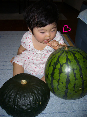 久しぶりの更新ですパパとネブタンと親子三人で、四国へ「讃岐うどんを食べに行こう」小旅行へ行ってました楽しかった~また後ほど更新しますちょっと前ですが、ネブタンと家の畑で採れたスイカとカボチャカボチャが良い感じで乾き、食べごろに大きな北海道カボチャです(奈良県じいじの畑産)カボチャは煮物も良いのですが、、、我家ではパパの大好きな「かぼちゃの冷たいスープ」と「かぼちゃプリン」に。(ばあばの煮物を男性陣はあまり食べないので)(材料)カボチャ、牛乳 オイルorバター、玉ねぎ、人参、コンソメorダシの素、 (大人用に ニンニク、塩コショウ、ナツメグ)カボチャの身と皮の2色スープです。畑の人参・玉ねぎも入れて栄養満点 離乳食にもぴったりかぼちゃプリンはママの定番で、学生時代から変わらないレシピいつもケーキの型で大きく焼きます(材料)皮を取ったカボチャ、卵、牛乳、グラニュー糖、ナツメグ カラメル(グラニュー糖、水)ネブタンも食べれるようにカラメルは薄目ネブタンもプリン大好きでたくさん食べたよ<かぼちゃプリンのレシピ 16-17cm丸型>・バターを薄く塗った型にカラメル(グラニュー糖70g・水35cc)を流し入れておく。・皮を取り粗みじん切りにしたカボチャ300gを牛乳200ccで煮崩れるまで煮、ミキサーにかける(回りにくければ残りの牛乳を入れても可)なければこし器で裏ごし。・別ボールに全卵L3個(M4個)と卵黄L1個を泡立てずにほぐしグラニュー糖40gを加えて混ぜ、粗熱の取れたカボチャを静かに混ぜる。・残りの牛乳300ccとグラニュー糖50g(カボチャの甘さで±5~10g)を沸騰しない位に温め、卵のボールに牛乳を(逆は×)泡出てないよう静かに混ぜる(あれば生クリーム30cc可)・こし器やザルで越し、カラメルを入れた型に静かに流しいれる。・バットや一回り大きい型にフキンを敷き、熱湯を型の1/2位が浸る程度入れ160℃に温め、オーブンで60分湯煎しながら焼く。・串などで刺し何も付かなければOK。型ごと冷ましてから串で型の周りを外し皿にひっくり返して出す。*簡単に省略して書きましたので、何かご質問がありましたらどうぞ*