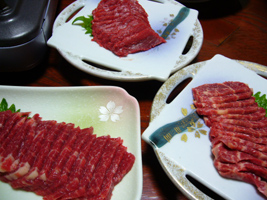 6月に青森に里帰り中、妹夫婦の招待で、妹婿の働いている某有名馬肉料理のお店へ行ってきましたそこの馬肉料理をちょっと紹介します妹と妹婿にメニューはおまかせ。ママも馬刺しと馬肉鍋くらいしか食べたことがないので、何が出てくるかドキドキでまずはやっぱり「お刺身」「特上ロース」と「特上霜降り」と「特上ヒレ」あと「心臓」が人気らしかったけどその日は品切れと・・・味は、やはり馬刺しは、臭み・くせも無く美味しい~「上馬肉鍋」ですお店によって味付けは様々だけど一番美味しかったあっさりした味で、お肉の味が生かされてました鍋は、特上より「上馬肉鍋」の方が脂があって美味しいとのこと「馬肉焼肉」ですパパも「焼いても美味しい~」って気に入ってましたあと珍しいところで、「馬タン塩焼き」固めの牛タン・豚タンのような感じ。タン好きのママは、これが特に気に入りました「馬レバー味噌焼き」ママも馬のレバーは初めてだったけど、普段レバーが大嫌いで食べれないパパが、「一番美味しい」と絶賛してたのには、ビックリでした「桜肉のにぎり」「桜肉の巻物」軟らかくて美味しい馬肉お寿司これにデザートも食べてお腹いっぱい一人前ずつのメニューを3人で食べて満足な量で1万円以内馬肉は、牛や豚と比べて、高蛋白・低脂肪で、しかもグリコーゲンといわれるスタミナ源が断突で多いそうです長時間走り続けるお馬さんならではの栄養源どんなお味かちょっとドキドキだったけど、牛肉などのように普通にすごい美味しかったのでビックリでした体に優しくて、しかも美味しい「馬肉」機会がありましたらだまされたと思って是非(*^_^*)今日は、朝からネブタンと9月から通う職場内の保育園を見学してきました人見知りするかな~と心配のママをよそに、早速大量のおもちゃに釣られ、ご機嫌のネブタンお兄ちゃんたちに 注目&おもちゃを貢いでもらい、楽しく遊んできました久しぶりの女の子に、先生方にも可愛がってもらい、すっかり長居して遊んでしまいましたママも今日は、事務のお兄ちゃんや保育士の先生たちに年齢を若く見られていたことを知りルンルン(単純)車に戻ると、遊び疲れたのかネブタンは寝ながらお煎餅かじってました9月から二人で頑張ろうね
