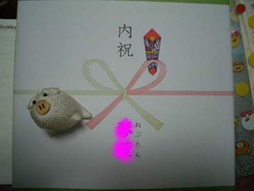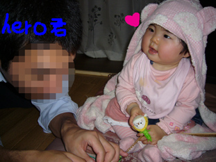 こんばんはお久しぶりです最近ご無沙汰していてすみませんお友達のイケメンhero君からバトンを頂いてました正確には、ラヴィさんとこのウサギのロン君 ↓hero君とこのウサギのアール姫 ↓うちのネブタンへ のバトン 『 ☆彡128代目バトン(ペット編)☆ ● ルール ● ・この中の質問を2つだけ削除する ・新しい質問を2つ考えて付け加える ・○○代目のところのカウントをアップする 』 ん? ん?? ん???ちょっと、 ちょっとちょと・・・・ペットって 書いてあるような ? ? ? ・ ・まあ、ネブタンに質問に答えてもらうだけみたいなので、ネブタン頑張りま~~す______________________ ☆第129代目(ペットじゃないんだけど編)☆  ̄ ̄ ̄ ̄ ̄ ̄ ̄ ̄ ̄ ̄ ̄ ̄ ̄ ̄ ̄ ̄ ̄ ̄ ̄ ̄ ̄ ̄ ★1★ 名前の由来は? (青森のお祭)ねぶた期間が生まれる予定日だったあたちに、 ねぶた大好きなheroくん&ぺ天使さん夫婦が、 強制的に「名付け親」になってくれました ↓↓ちなみにネブタンの「内祝いのお熨斗」です★2★ 最近のお気に入りの遊びは? 体を鍛えること 色んな物を押して足腰を鍛えてまちゅ ママに似てかなり「力持ち」なんでちゅよ ★3★ 好きなコスプレは? パパのお気に入り☆ イチゴでちゅ 次は、ナースに挑戦ちようかな★4★ 好きな食べものは? おにぎり、うどん、大根、おせんべい、くだもの、かっぱえびせん 「一才からのかっぱえびせん」一歳の誕生日に、 おっちゃん(パパの弟)に買ってもらってから大好物 やめられない♪ 止まらない~♪ ★5★ 特技は? 「チュッ」って言いながら、ママにキスするの パパの頭をなでなでしてあげるの ★6★お気に入りの場所は? 高い台の上、じいじのお部屋、お風呂場の体重計の上、 一番は、パパの腕の中 お風呂も寝るのもパパの腕の中がいいの ★7★ なぜかやめられない事は? おしゃれ~チェーック 自分の姿を確認するために、鏡の前に歩いていくの 女の子でしょ★8★ 嫌いなことは?? あたちのすることを止められること じゃましないで!! ★9★ 自分を芸能人に例えると? 昔は「朝青龍」、6ヶ月のネブタンです 今は「グレムリン」って呼ばれているの 将来は「松嶋菜々子」を目指していきまちゅ ★10★ 次に回す人 ペットが居る方でもらってくれる方よろしくです家の裏の柚子の木からの収穫ですお友達のアール姫のところにも里子に旅立ちました無農薬なので、また家族の大好きなシフォンケーキ作りたいです今日は、夜勤明けでした明日寝て起きたら、遊びに行きますね