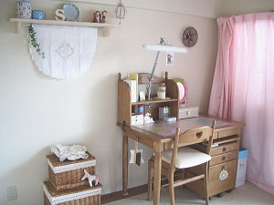 またまたお久しぶりです・・・( ;^-^A先日カリモクの学習机を購入して、2ヶ月たったので事後報告をします。私はカントリー調のブラウンのデスクを購入しました。本当はもっと水色の比率を上げたかったのですが、娘が4歳のときに買ったカーテンとおもちゃのドレッサーを置く場所がどーしても無くて、ちょっとピンク混じりの部屋になってしまいました・・・(ToT)まあ部屋のアレンジは自分的にもひとつ物足りないので、軽く流していただいて・・・・机を入学時に購入することについては、置く場所が無いなどいろいろ悩みましたが、学習はもちろん、収納としても買っておいてよかった♪というのが正直な感想です。リビングで私を困らせていたクーピーなどの画材や落書き帳、細かいシールなどが全部整理できました♪子供部屋が2階にある方は机なんて買っても飾りになるだけかも知れませんが、うちのように極狭賃貸暮らしだと、キッチンから全ての部屋が一望 ( ´ Д ` ) できるので、子供がママが見えないという不安に駆られることも無いらしく、テレビがうるさいリビングやダイニングより、机で勉強しています。親的にも教える際に大して移動することも無く、ダイニングで教科書が濡れる様な心配も無いのでとっても満足です。机自体もニュアンスのある素敵な仕上がりだし、汚れも目立たず、茶色にして良かったな~と思いました。細かい部分(トレーやフックなど)も全部木製なので、安っぽい感じがなく、大満足です!そしてこのモデルは板脚でなく4つ脚なので、どこからでも足が入れられて便利です。脇で座りながら勉強を見ても足が当たりません。机の役目を終わるとダイニングやドレッサーにも応用可能らしいし・・・。私たちの時代より、引き出しが浅いのはちょっと不満ですが・・・(`з´)ワゴンを収納式にするとある程度しょうがないらしいです・・・。購入時に迷った上置きはあった方が断然便利ですよ~。目の前に教科書やドリルがあった方が、子供が意識して勉強しますし、別で本立てなどを買うよりスマートに片付きます。私自身うまくまとめるセンスもないし・・・・1年生だとまだそんなに本の量も無いので、ハーフサイズで十分です。教科書など良く使う本以外は深い引き出しに立てて収納してあります。机の幅は110cmありますが、子供は半分しか使ってません。1年生にはやはり大きいみたいです。今後は使うと思うので、大して気にしてませんが。幅で迷っている方は、90センチくらいでもいいと思います。ちなみに脇のバスケット(★送料無料★NEWフタ付きバスケット レースS+L 【0222春先10】)に、学校で使うタオル類や帽子など隠したいものを収納させています。後は勉強を見るときに私が座るスツールが欲しいなあ・・・・