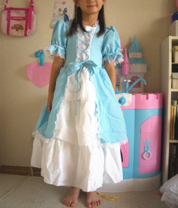 手持ちの遊び用ドレスのサイズが小さくなり、友達に借りてばかりが申し訳ないのでロワイヤルアリス 子供ドレス ワンピース 100-130cmを購入してみました。もうちょっとシワを取ってから撮影すればよかった・・・とちょっと後悔気味の写真ですが、届いてすぐに撮影してみました。身長120cmの娘が130cmを着ています。思ったより長めでワンピースというよりはドレスといったところでしょうか。内蔵パニエ付とのことでしたが、写真のようにふわふわスカートではありませんでした。たぶん空気を入れるようにスカートを広げればもうちょっとボリュームが出るかもしれませんね。別売りのエレガントパニエウエストフリーサイズをはかせると、↑このくらいのボリュームが出ました!娘はちょっと細身なので、身幅の調節が出来る編み上げのデザインはとても便利でした。これがなければ結構ぶかぶかだったかもしれません。生地は思ったより厚地ではないので夏でも暑すぎず、オールシーズン使えそうです。心置きなく洗濯出来そうなので、遊びやTDL用、普段使い用にはぴったりかも。130cmとしてはお手ごろだし。ただ結婚式や発表会用として(他人様に披露する目的)の小学生以上のお子さん用としては正直”イタイ”気がします。うちの娘は身長は高いのですが、まだ幼稚園児なのでぎりぎりですかね~。このデザインは小さい子の方がかわいく着れると思います。あくまで『遊び』やTDLなどでの『コスプレ』として使うなら、3段フリルや編み上げの姫的要素が満載なので、子供は大満足だし、お手入れのしやすさとお手ごろな値段で母も満足ということでお勧めです。七五三、発表会用にドレスを探す>>