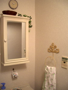 こんにちは。久々の雑貨レビューです。うちのタオルハンガーが壊れたので、サークルフックを買ってみました。ちょっとロマ系が入ったカントリー風になったかなと満足しております。最近北欧のすっきり系より若干ブリティッシュカントリーやフレンチカントリーに傾倒してしまっているので、「北欧&カントリー」の趣旨がだんだんずれてきてしまっている気がします・・・。北欧好きな方すみません。ちょっと高めの位置に取り付けましたが、フックの付け根の部分に子供が頭を打ち付けないよう配慮した結果です。賃貸なので、最後までねじ止めをためらいましたが、タオル掛けは子供もパパも使うし、フックで引っ掛けてあるだけだと引っ張られて外れたりするので、思い切って径2ミリのねじで固定しました。(壁は板壁の上に壁紙を張ってある状態です。)これなら穴もそう目立たないと思います。ちなみに隣のキャビネットはhomesteadのミラーキャビネットです。中にいろいろ収納できるので、とっても便利ですよ。洗面所周りにおすすめの雑貨です↓↓↓