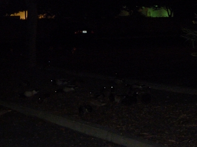 会社の帰り駐車場に かも軍団が、ぐわーぐわー 20羽くらいが、えさを探していました去年の今頃も 同じように、かも軍団がいました たしか~ブログにも書いたような気が~です今回は、カメラで写しました しかし、真っ暗です>< かもの目だけが光っています