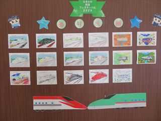 JR古川駅2Fコンコースで「ふるかわ鉄道フェスティバル2025」で塗った ぬりえが展示されています。