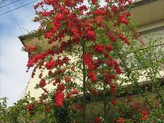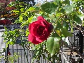 散歩の途中で赤いバラが咲いてるのを見つけました。