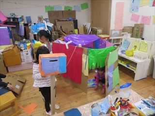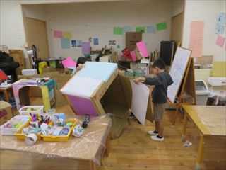 マーガレット(年長)組の子どもたちは11月13日(木)より市民ギャラリー緒絶の館で 行わる「日々のあしあと展」に向けてダンボール箱を使った共同作品を作っています。