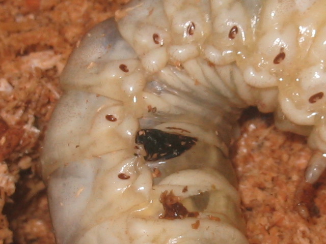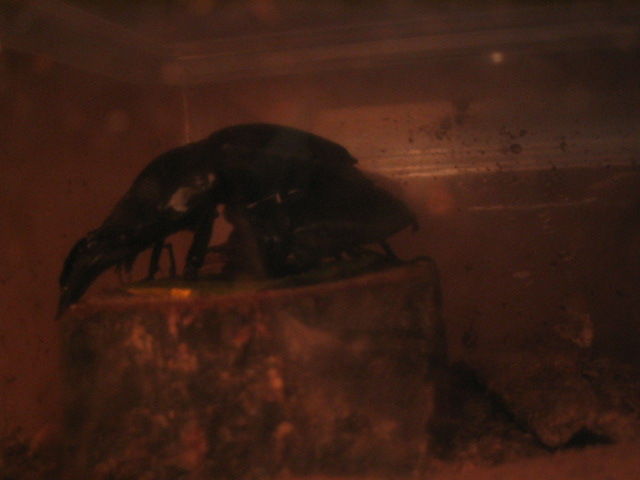 我が家には老人ホームもあります。生まれつき(羽化)不自由な虫もリタイヤした虫も我が家ではVIP待遇です。「これはもうダメだな」と思っても必ずゼリーも入れてあげます。そういった虫は殆ど食事もとりませんが、礼節だけは示したいのです。良く「使用済み」と言って売りに出される方がいらっしゃいますが、個人的に私がそれをやりだしたら、虫はもう仕舞いにしようと決めています。たとえ需要があったとしても、死ぬかもしれない虫を他人様に譲る事は考えられません。虫にも失礼だし消費者様にも失礼になるやもしれません。やはり自分が世話になった虫は最後まで面倒を見るべきだと思います。(親しい知人から急遽「オスを貸してくれ」というオーダーに答える事はありますが)※:これは自分自身のガイドラインです。私は売買もしますし、他人様をとやかく言うつもりもありません。またそれを生業としている方やWDのB品などは意味自体違いますから誤解なさいませぬ様宜しくお願い致します。m(_ _)mところで話は変わりますが、ペアリングさせていたレギウスの続報です。昨晩「ガリッ」という音を耳にして急いでケースを見ましたところ、メスが鋏まれているじゃ~あ~りませんか、(▼皿▼メ)ノコラ~先日までメイトガードを確認していましたので、5日経った事だしと思い解除しました。メスには直ぐにSETに入って頂きましたところ・・・・即穿孔。いい感じです^^)現在は穴も埋まっています。明日もっと細かいオガが出ていればラッキ~です。材は高価なので、すんなりいってくれるとありがたいのです。どうなりますやら・・・^^;PS:昨日病院の事を書きましたが、私が風をひいてしまいました。┌┤´д`├┐ダル~ネタも切れ気味でボヤキまで入っちゃいました~、ゴメンナサイm(_ _)mレギウス・タランドゥス KRAFT WERK