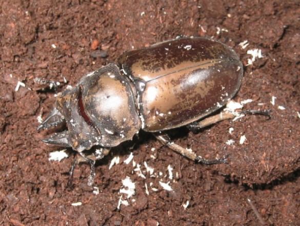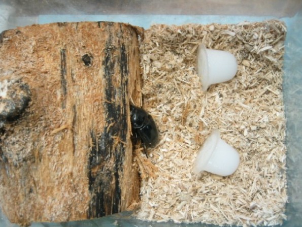 最近更新をサボりっぱなしです(;^_^A申し訳ない^^;言い分けですが、このところ毎日多くの皆様より御質問を頂いており、1日2時間位お返事を書いています。なかなか更新できません。許して下さい^^;今日は先日産卵セットを組んだレギウスの様子を見てみました。ここ数日材の上を行ったり来たり踊ったりw今朝エサ換えの時に20度前後の所に置いて、材の穴に挿し込んでおきました。結果は?・・・・・現在もオガを出して穿孔中です。第一関門突破ですね^^このまま1週間出てこなければ成功でしょう^^)KRAFT WERK
