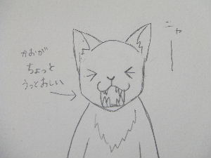 それは先週末のことでした。ごはんを催促していたキャラが、「ニャッ」と口をあけた時、ふと、違和感を覚えました。「あれ?口元がなんか、ヘン」キャラは滅多に鳴かないので、口をこじ開けてよく見てみると、上下の犬歯が二枚歯になっているではありませんか~そうなんです。キャラにも永久歯が生えてきました~人間と違って猫って、永久歯が生えきってから、乳歯が抜けるんですね~。確かに、一時でも歯がないと言うのは、野生で生活していたらそれこそ死活問題。さすがに写真は無理だったので、絵を描いてみました(笑) 実は、もう下の歯は抜けてしまったんです記念に欲しかったのですが、何せちっちゃいので、到底見つかるはずもなく・・・。きっと、ごはんと一緒にゴックンしちゃったんだろうな。でも、まだ上が二本残っている!めでたくgetできたら、家の縁の下に「丈夫な歯にしておくれ~」って、放り込んであげようと思います。