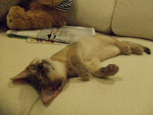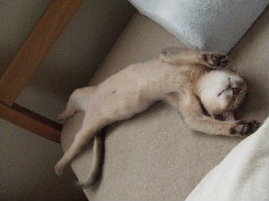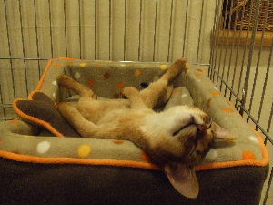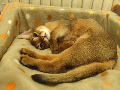 アビシニアンのキャラは、よく腹を出して寝ています。獣がそんなに急所を出してちゃ危ないよ・・・と思うのですが。ま、かわいいからいいんですけど。猫が気持ち良さそうに寝ているのを見ると、何だか癒されますね。いやな事があっても、まぁ、いいか~って気分になります。ウチは実際、つまらない夫婦喧嘩が減ったと思います(笑)