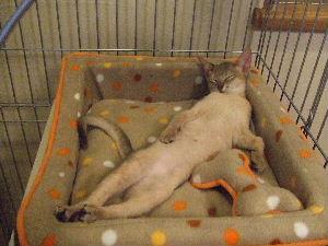最近のキャラの腹出しねんねのスポットは、猫ゲージのベッドです。 ちょうどエアコンが真上にあるので、暖かい風がそよそよ吹いてくる一等地です。暖房をつけると、すかさずゲージに引きこもります。一番良い場所を陣取られて少しくやしいです「でも、かわいい寝相が見られるから、ま、いいか」と、キャラの頭をナデナデしてあげると、チロッと薄目をあけてこっちを見ます。「あー、あったかいニャ。トモ蔵もくる?あ、でもトモ蔵はおっきいから入れないニャ。残念ニャ~。」そして、再び気持ち良さそうに寝入りますう~ん、やっぱりくやしいかも。