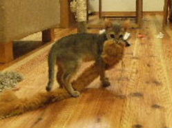 最近寒くなってきたので、マフラーや手袋を出してみました。もちろん、キャラもお邪魔をしにくるものだと思っていたのですがどうも興味がないのか、隣の部屋でドタバタ走り回っている。ラッキ~♪今のうちだ~♪とせっせとお片づけ。それにしても、キャラはなにをあんなに夢中になっているんだ??ふと気になり、覗いてみると・・・「・・・・!!!」そこには、私のお出かけ用のラビットファーの襟巻きをくわえ、得意満面な様子のキャラが・・・「い、い、いつのまに・・・・」慌てて取り返そうとしたものの、「コレはキャラが捕まえた獲物ニャ!横取りは許さないニャ!!」とウーウー、グルグル必死に抵抗。 そして大捕り物の末・・・襟巻きはプツンと二つに切れましたとさ。そして二つになった襟巻きを、仲良く二人で分けましたとさ。めでたしめでたし・・・って、そんな訳あるかい!!が、しかし。襟巻きを取り上げてみたものの、キャラのヨダレでペトペトしているし、毛もだいぶ抜けている・・・仕方ないのでキャラにプレゼントしました。良かったね、キャラ。めでたしめでたし。
