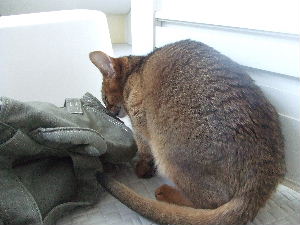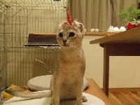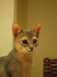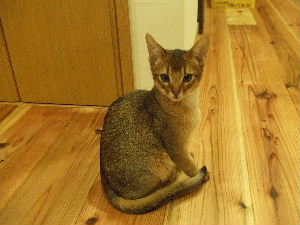 名前:キャラ(伽羅)由来は香木の名前です。あと、某ネコ漫画に出てくるアビシニアンから頂きました。2006年7月5日生まれブルーの女の子我が家にやってきたのは10月1日です。私もダンナも猫が大好きなので、「いつか飼いたいね」とは言っていたんだけどある日ペットショップで子猫を見たら、どうにも欲しくなってしまい、衝動買いしてしまいました。これもまた、運命ですよ。性格は、う~ん・・・食いしん坊。食べ物に対する執念は、凄いものがあります。粘り強いと言うか、めげないと言うか・・・成長期と言うことを差し引いても、その食欲は凄いものが・・・おかげですくすく育ち、1ヶ月足らずで↑の写真より30%ほど増量してますね。そんなに急いで大きくならなくてもいいよ~と思ってしまうのですが、ま、元気な証拠なので良しとしなければいけませんね。
