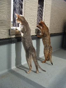 ウチのベランダには、20×40cmほどの窓というか穴が4つ程あります。たぶん、外から見たときの見栄え上、設計士さんが入れてくれたのだと思われる。人間にとってはまったく実用性のない この小窓。ところが、これがネコたちには大好評ここから外を覗くのが、大好きな2匹です 宇多丸 「あれ? おとなりのペロは またおさんぽに行くでしか?」キャラ 「おくさんのダイエットにつき合わされてるのよ。犬さんも大変だニャ。」宇多丸 「ほんとでしゅね~ ぼくたちネコでよかったニャ」 あと、影踏み(?)も大好き これも、夢中になっちゃうんだよね~ ベランダは、唯一お外の空気を吸える場所だから、2匹とも大好きなのです