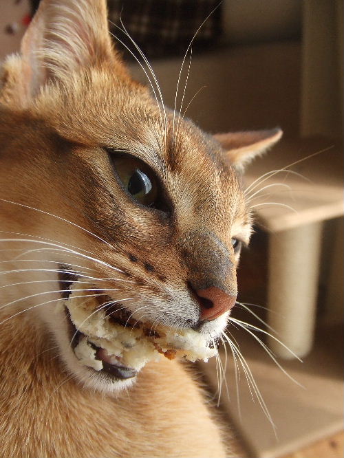 せっかく、ピントも合って、きれいに撮れたのに、こんな顔なんて 加熱に失敗して堅くなっちゃった肉まんをごみ箱から掘り出し、頬張る宇多丸くん 最近の彼の食欲は、とどまる所を知らない・・・人間で言えば、ちょうど部活やってる中学生くらいの年齢だから、仕方ないのかな。でもこの先ずっとこの食欲だったら、チョト、めげるゾ がぁっはっはっはっは!!!喰えるものは喰うニャ!! こ、こわいよぅ・・・