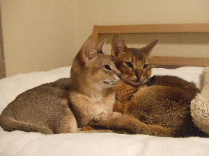 次男坊の宇多丸がやってきて、一週間が経ちました。すっかり、お姉ちゃんのキャラとも仲良しさんになってくれて、トモ蔵は一安心です この一週間で、だいぶ宇多丸の性格がわかってきました。ものすごい甘えん坊で、普段はおっとりしていながらもちゃっかり者というか、とっても要領の良い子です。この前の土曜日、我が家にわんさかお客さんが来た時も変わりばんこに、いろんな人の膝に乗っては、ゴロゴロと甘えて一躍みんなの人気者になっていました。一方のキャラは、基本的には人懐こいのですが、そう言うのがめんどくさいようで、ゲージのベッドで、暖房に当たりながら、ひたすら傍観 驚いたことに、たいていの猫に嫌われる姪っ子にも、おとなしく(というか、仕方なくというか)抱っこされていました宇多丸は間違いなく、次男坊気質ですね~。 あと、よく鳴きます。本当によく鳴くんですキャラがほとんど鳴かない子なので、宇多丸がきてから「猫ってこんなに鳴いたっけ~~??」と、ちょっと新鮮でした。お腹がすいたといえば「にゃ~!」お腹がいっぱいになっても「にゃ~!」遊んでいたおもちゃがどっか行っちゃったと「にゃ~!」とにかく、おしゃべりさんです。イタズラが見つかった時などは、小さい声で「ニャニャニャッ」と言い訳もします。その様子がまた、かわいくて笑えますうっかり締め出しちゃった時とかも、大声で鳴いてくれるので、見つけやすくて助かります。 同じ猫で、同じアビシニアンなのに、性格がまったく違うので、毎日見ていて本当にあきませんお陰で、最近引きこもり気味であります。・・・冬ですからね。許してください