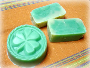 久しぶりに石けんを作ってみた 今回作ったのは、「お茶」にこだわった石けん 茶油に桂花烏龍茶を漬け込んで、精製水の代わりに緑茶を使って、葉っぱつながりって事でモールドもクローバー 石けんの色もみどりにしてみました