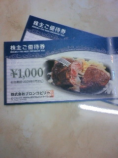 やっと着ましたよ株主優待の食事券ですあと配当金もちょっぴりですが付いてました株価は暴落してて、内心ヒヤヒヤもんですがね。自分の場合は、優待目的の1ホルダーなんで気にしないようにしてます。この不景気にアリガタイ贈り物ですがんばれブロンコ