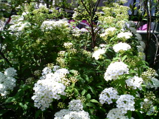 おはようございます。今日は、朝から町内会の溝掃除に参加してきました。ご近所には新しい家も増えていて、人手が多いのであっという間に終わります。でもそのあとの集まりはいつも通りの時間に始まるので、いつも待っている時間のほうが長いようです・・・我が家の庭では、蕾が出来ていたコデマリの花が、に一気に咲き始めました。そしてこの時期になると、昔球根で植えた名前も忘れた花が、花壇に現れます。ローズマリーにも、薄紫のきれいな花がついていたので、寄せて活けてみました。次は何が咲くか、楽しみですね~