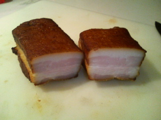 おはようございます。今日も朝からよく降りますね~今日は各分譲地を全社員で掃除をしよう!という日なんですが、すっかり忘れてました集合時間まではまだあるので、大丈夫ですけどねとはいえこの雨だと、建物の中しかできないでしょうね~さてさて、先日から自宅でスモークにハマッていると話しましたが、この度ベーコンが出来上がりました!実は前回一度チャレンジして、しょっぱかったのと火を通しすぎたのとであまり美味しくなかったんですが、今回は味・食感・見た目全て合格です。生で食べるのはちょっと不安なので、色んな料理に使ってみようと思います。最終的には、売りモノに出来ますかね~