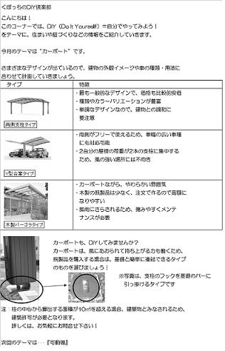 こんにちは。今日から展示場でイベントのため、朝から当番です。さてさて、毎月発行している情報紙の、私が担当するDIYコーナーの原稿が出来たので、そのままご紹介します。見えるかな?DIYでカーポートはちょっと難易度が高いですが、簡単な工事に慣れてきたらチャレンジしてみましょう!!