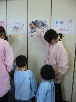 今日は息子の英語教室の日。「えーご いかないの」と予防線を張る息子。家では楽しくアルファベットポスターを指差して歌ったり、CDに合わせて歌ったり、音の出る教材を自分から持ってきて遊んだりしているんですけど、照れくさいのか元々リトミック系は苦手な息子にはツライのか?今日も息子だけ母から離れず、しかも今までで一番べったり・・・カードも出さず、テキストも出さず。シールを先生が出した辺りから、ちょこっと手を出すようになってきて、でも母からは離れず・・・少しづつ少しづつ、そーっと離れて初めて部屋を出て廊下の椅子に他のママさんたちと座ることができました!時間にして5分ちょっとかな。でも最後はみんなで手を繋いで歌を歌う事もできたそうです。「ひとりですわれた~」ととっても満足そうな息子でした。