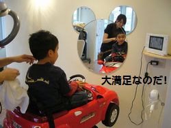 予報どおりの雨お姉ちゃんの運動会は順延です。きっと雨だろうと思って息子の髪を切ってもらう予約を入れました。広告に写真が載っていて、それを見た息子が「ここ、行ってみた~い!!」というもので・・・椅子が車になっていて、ハンドルも回るし音もなるし、ライトも点いちゃったりなんかして楽しいのです。しかも鏡はミッキーシルエットだし。DVDでアンパンマンを流してくれているうちにチョキチョキお店を出た後「あ~楽しかったぁ~!お姉ちゃん可愛かった」ですって(笑)あ~男の子なのねぇ~と思った瞬間でした。