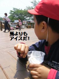 今日は保育園の親子遠足。【まかいの牧場】です。魔界???と思ったのですが、馬飼野さんがオーナーさんということで・・・ビックリした・・・到着してまずは集合写真。ウエルカムドリンクの牛乳を頂き、自由行動となって、みんなは牛の乳搾り体験へ。で、我が息子は・・・というとまずは何よりもアイスクリーム!バスの中で「何食べようか~」と言い続けた母がいけないのかも。さぁ!アイスも食べたし、動物見に行こうか!と誘うも息子は動物よりも・・・そう、動物よりも【乗り物】なのです。うさぎやひつじの近くまでは行っても触ろうとしません。みんなが動物のヌイグルミをお土産に買う中、息子が選んだのは結局、1枚も動物と撮った写真の無い牧場への遠足でした(笑)