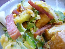 今日の朝ごはんは、グリーンカーテンから収穫したゴーヤを使ってチャンプルーにしました。水曜日からはお楽しみの沖縄旅行なのですがゴーヤが食べきれないので持って行こうかという話をしていました。沖縄に神奈川のゴーヤを持って行くって変?でもウィークリーマンションで自炊なのでそれも有りだなと思ってます。