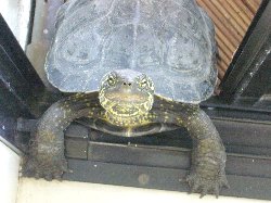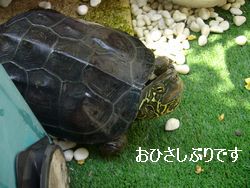 朝、ベランダに出して そのまま忘れられていた【かめきち】。なにやら音がすると思ったら網戸を開けて、今まさに部屋に入ろうとしているところでした。ごめんごめんエサあげるよ~