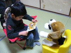 大の仲良しのイヌのぬいぐるみ らぶりん。今日は椅子に座らせ、自分も椅子を持ってきて向かい合わせに座って 何をしているのかと思ったらかさじぞうを読んであげていました。