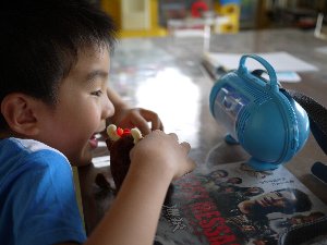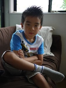 前髪に水をつけて自分でアップに息子が自分で考えたヒーロー【やざる】の髪型らしい