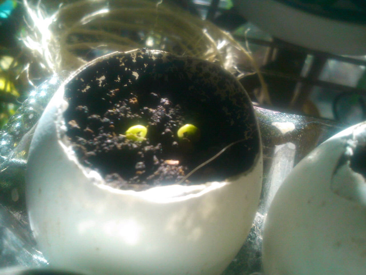 自宅でタマゴの殻で発芽ポットを。芽がでました。