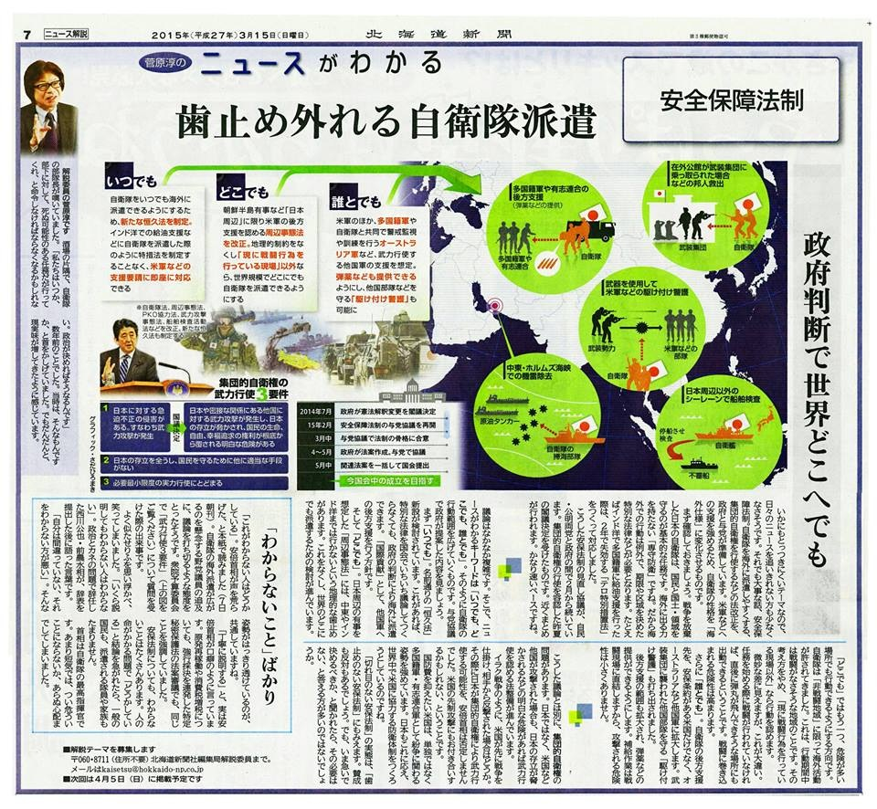 北海道新聞で不十分ながら、戦争立法の見開き特集をしていたそうです。サンケイや読売にしろとは言わないけど、朝日や毎日も見習ってもらいたい。