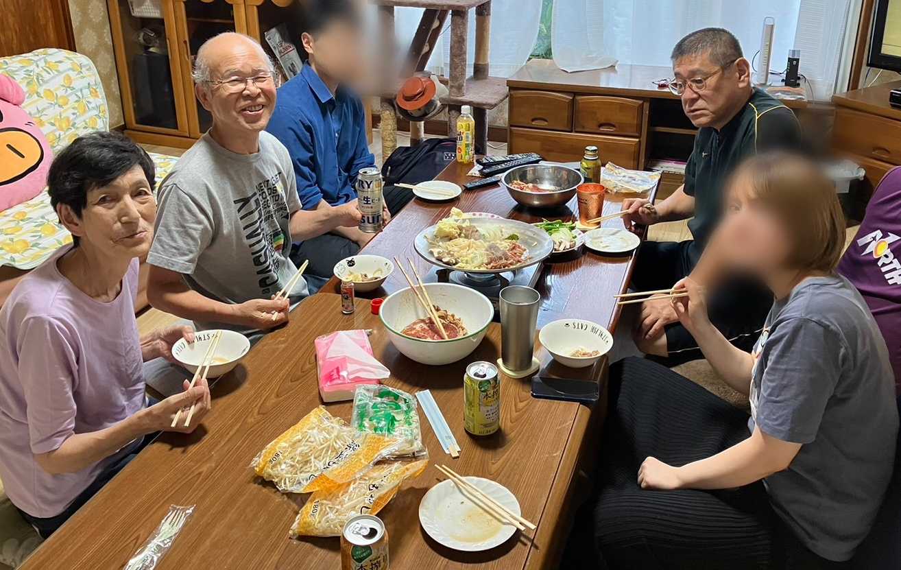 引っ越しも一段落、明日は三回忌なので今日は長女と次男が帰省。明日は長男がオートバイで法要に間に合うように帰省します。明日は法要後の精進料理を用意していないので、今日の夜宴をと考えていたのですが、今日まで忙しくて何も用意をしていないのにも関わらず、午前中にプレハブ練習場の解体が始まりましたので、ホームセンターに行ったり、スーパーマーケットに行ったりしてるうちに、畑を見に来てくれた義父母がインターフォンを鳴らしました。なんと❗忙しくてお誘いするのも忘れておりましたが、なんとか一緒に宴に参加していただけました(笑)外は猛暑なので、エアコンが効いた部屋で「和寒町金子ジンギスカン」をいただきました。花の友はもちろん世界一ですが、自宅でのジンギスカンはやはり金子ですな(笑)