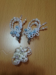 ブローチを作って、意気揚々としていたら、ヘアアレンジも気になった。そういえば、髪を切ってからのフォーマルは初めて。手持ちのはロングヘアをまとめる用のばかりなので、市場視察に・・。オットのポケットチーフを買いに行ったついでに、自分のヘアアクセ売り場を覗いたら、なかなかかわいいのが売られていた。こんなのかな・・と思って手にとったが、あまりの値段に驚愕。買えぬなら、作ってしまえ。手芸屋でカチューシャ台座やら、コーム台座を買い込んで早速開始。だいたいこんなもんかな・・・。ひとつできたところで調子に乗って、もう一つ。キラキラ系とパール系と、いろいろやってみました。製作にかかった費用は、ひとつあたり¥1200くらい。やっぱり手作りは楽しい!