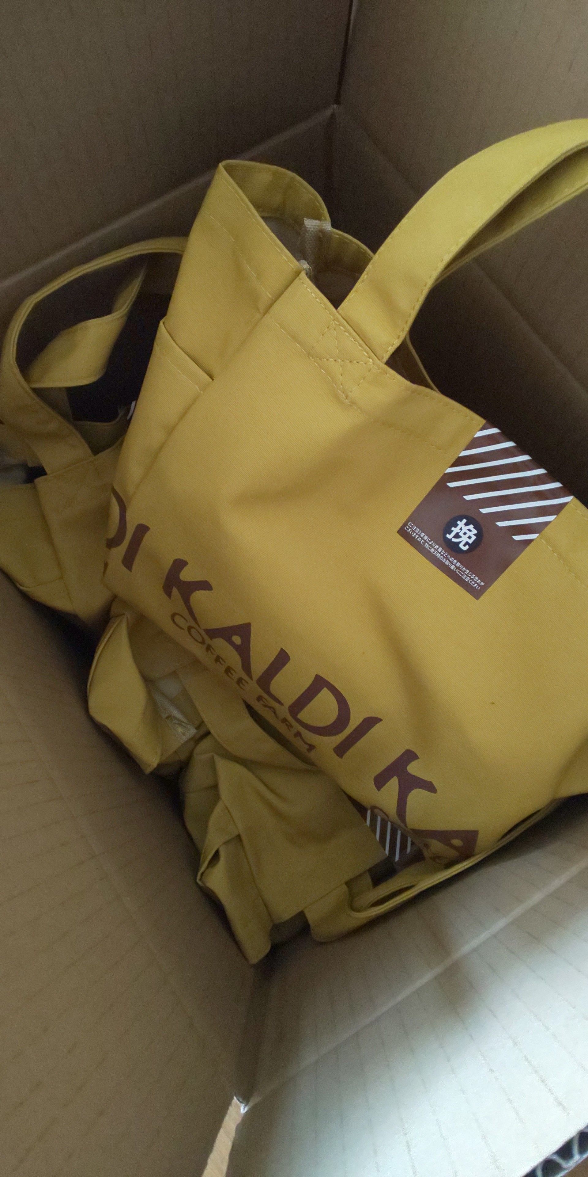 4個まとめ買いして 送料を抑えました😁 と言っても、無料にはならず。。 今後、もっと安くなると 買いやすくなるのですが。 カルディさん! 欲しいものはたくさんあるのに 送料でためらいますよ~~ *カルディオリジナル ドリップコーヒー&マグカップセット[税率10%] カルディオリジナル クリーミーシュガーパウダー スティック 10p[税率8%] <12個>カフェカルディ ドリップコーヒー マイルドカルディ(10g×10p)×12個[税率8%]【賞味期限:2020/10/23〜11/21】 コーヒー福袋。 全て売れていて、最後の福袋でした。 黄色好きだなぁ。 トートバッグ。 お弁当入れに。 *カルディオリジナル 豆乳ビスケット アソートパック 18枚[税率8%] *カルディオリジナル カカオの森 アマンドショコラ コーヒー 60g[税率8%] *カルディオリジナル カカオの森 アマンドショコラ ビターキャラメル 60g[税率8%] カルディオリジナル パンダ杏仁豆腐 ミニ 215g [税率8%]【賞味期限:2020/5/10】 カルディオリジナル 豆乳サンドビスケット 10p[税率8%] *カルディオリジナル 紅茶のリーフチョコ 5p[税率8%]【賞味期限:2020/6/30】 カルディオリジナル グースベリーインダークチョコレート 45g [税率8%] カルディオリジナル ブルーベリーインダークチョコレート 40g[税率8%] *カルディオリジナル ひよこ豆チップ 40g[税率8%]【賞味期限:2020/5/26】 カルディオリジナル アップルスティック アルミ 28g[税率8%] 明日からは マグカップとチョコと、コーヒーの スペシャルセットが販売されます❤️