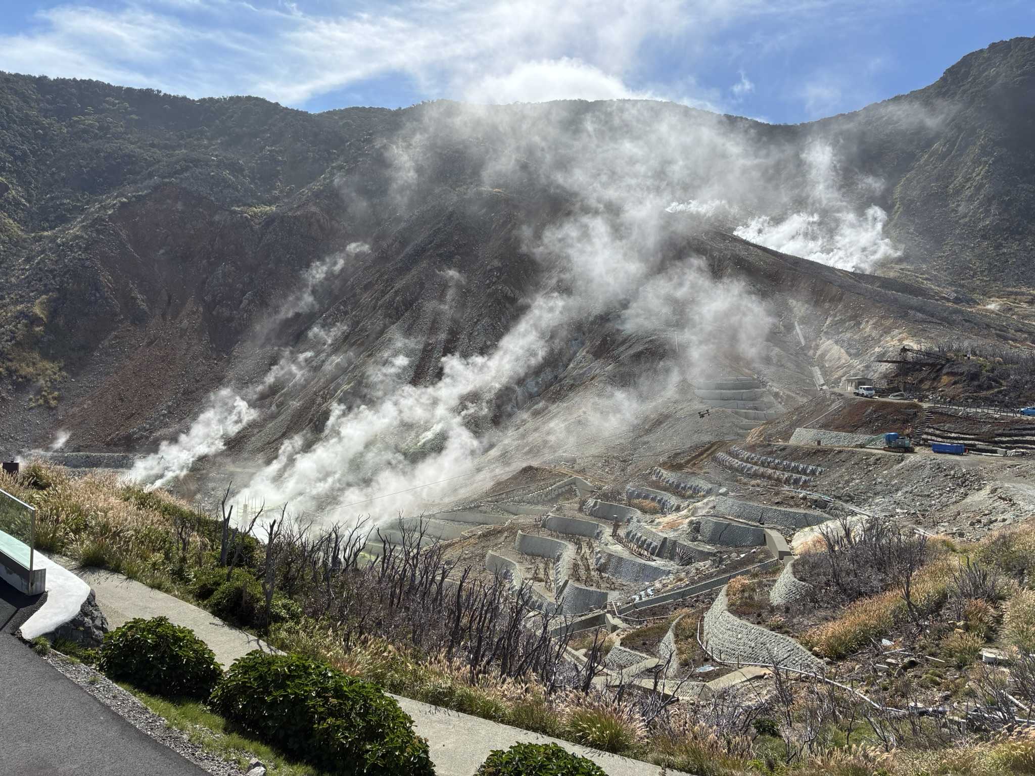 二日目、宿をチェックアウトして、大涌谷観光へ。↑↑大涌谷の風景、硫黄臭いですw。火口の跡で噴煙が立ち上っています。近くに行ってみたいけど、立ち入り禁止の模様。ここに来たのは小学校の遠足以来かな~。↑↑温泉黒たまご1個食べれば7年寿命が延びると言われる卵です。確か4個で700円程度だった。気になる方はググってみてください。2個食べたので、14年寿命が延びたか?笑