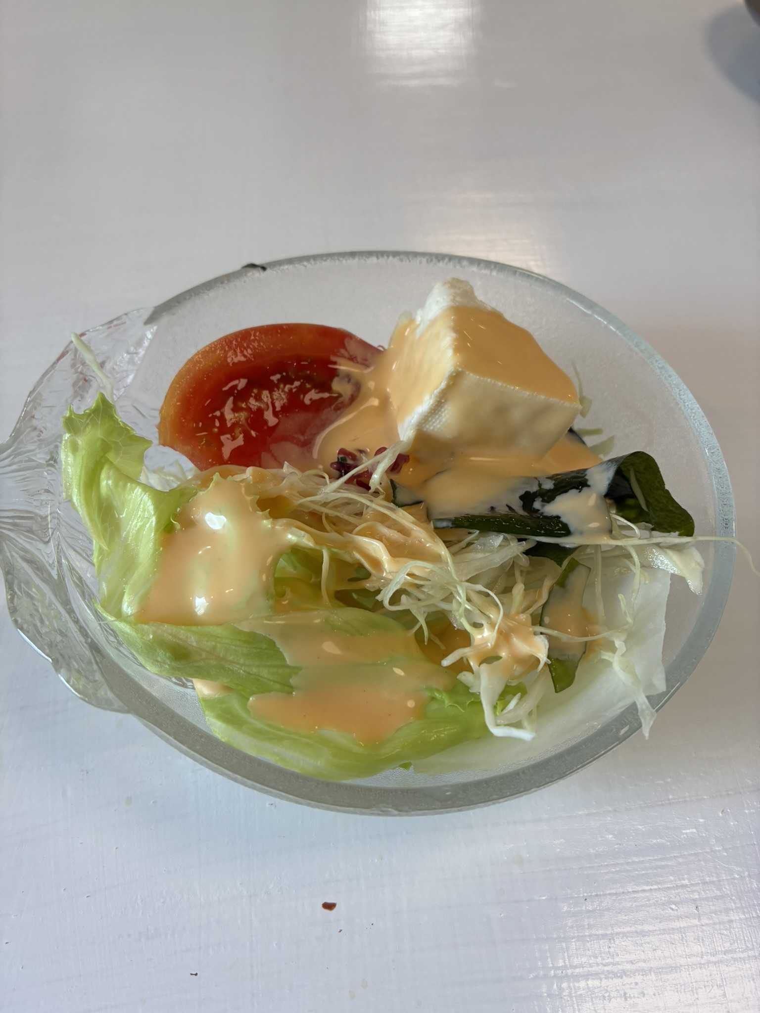 昔取った杵柄(台湾滞在が多かった)か、無性に魯肉飯(ルーローファン)を食べたくなって出撃してきた。お店の名前は”キッチン愛”、宇都宮西側の中央警察署付近です。駐車場は店の裏手の未舗装の空き地みたいな所で、目印は無いようでした。(店の裏側を10mくらい行った、突き当り手前の右側、駐車区画とかありません)ママさんは台湾の台北出身で、気さくで楽しく宇都宮で頑張っているとのことです。ランチ時は、1000円で以下のようなセットにありつけます。↑↑サラダ。↑↑魯肉飯と麻婆豆腐(麻婆豆腐は前菜)魯肉飯は鰻重のような器に入れられてきた。左上側に四角く見えるのが甘辛く煮込んだ豚肉です。味が染みてて台湾と変わらぬ食感、美味しい。両面焼きの目玉焼きも台湾風で懐かしい~、この焼き方は日本では見かけませんよね?麻婆豆腐はそんなに辛くもなく、日本人向けと思います。ただ欲を言えば、器はやっぱり丼の方が良いと感じました。肉汁がご飯に幅広く行き渡り、最後の一粒まで肉汁の味を楽しめるかと。食後のお茶、ウーロン茶と金木犀のお茶(黄色の皿の上)。サッパリしていい香りです。デザート、サッパリとしていて、あっという間に食べてしまいました。久々の台湾風味、美味しかった!量もけっこう多いのでお腹いっぱいです。刀削麺もメニューにあるので、近いうちに試してみようかと思っています。平日昼間に外食ランチを楽しむのも、定年退職後の楽しみになりそうです。