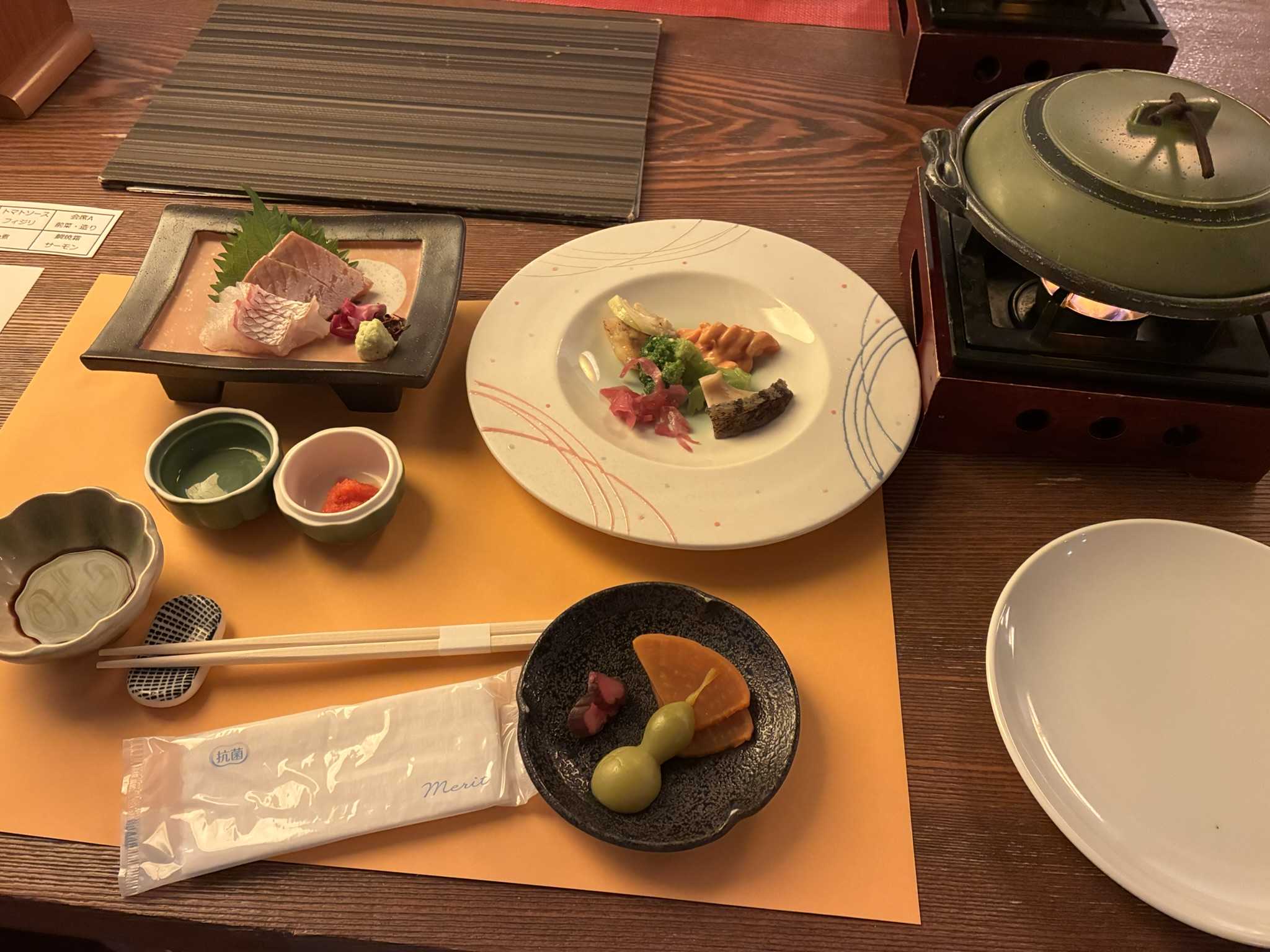 宿での食事↑↑食事↑↑メニュー以前、宿泊したときよりも食事の質は落ちていたような気がする。以前は和食と洋食の選択が出来たのですが、今回は選択肢が無かった。料理自体はとても美味しくて文句なしでしたが、ご飯は価格高騰のせいか、いまいちでした。まあ久々の一泊旅行でもあり、十分楽しむことができました。
