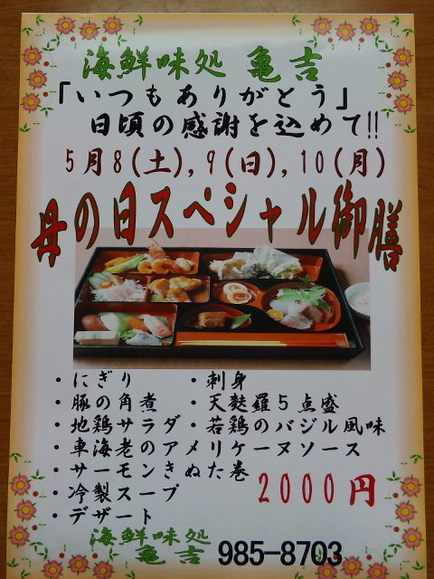 こんにちは~GWが終わったと思えば・・・もう、次のイベントがやってきましたみなさ~ん明日5月9日(日)は、母の日ですよ~亀吉では、本日5月8日(土)・9日(日)・10日(月) 「いつもありがとう!!」日頃の感謝を込めて 「母の日スペシャル御膳」を御用意しましたみなさ~ん母の日の予定は決まりましたか是非 お母さんと御一緒に亀吉へのご来店お待ちしております スタッフ:Nより 久米島: 23℃