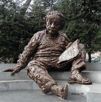 インドの詩人タゴールに送ったアインシュタインの言葉があります。「真理とは人間とは無関係に存在するものなのではないでしょうか。たとえば、私が見ていなくても、月は確かにあるのです。」量子力学の世界では,そう問いたくなるような事実があるそうです。ーー「見ようとするから見える。聞こうとするから聞こえてくる。」という単に選択的な知覚のことではなく,「世の中のすべては,事実があるから常識があるのではなく,常識があるから事実を生じている可能性がある。」という話には,とても不思議な感覚で捉えました。2度目のワシントンDCのモール地区で出会った「すわっているアインシュタイン像」像の本にも,宇宙方程式と質量とエネルギーの方程式がありました。
