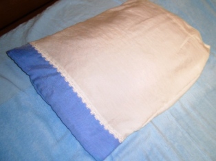 古くなったスカート。裏返して両端と裾を縫ったら枕カバーになりました。結構手芸が好きなの。まぁ、こういう実用的で簡単なものしかつくりませんが。ただ、ミシンは実家にあるから、全て手縫いだ……。