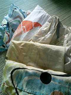 今日は、家の近くの観音さん古道具市がありました。そこで、古い夏帯など買い込み早速ほどく少し汚れています色も潤んでいる・・試しに昨日買った、ウコンの粉末で染め物をしてみることに安い着物は、破けやすく、染めてみたのですが、もと布が黄ばんでいるので、いい色がでません(TT)難しいですね。手前2枚が、染めた物・・・わかりにくいですねよけいに、黄ばんだように見えます(TT)難しいわ