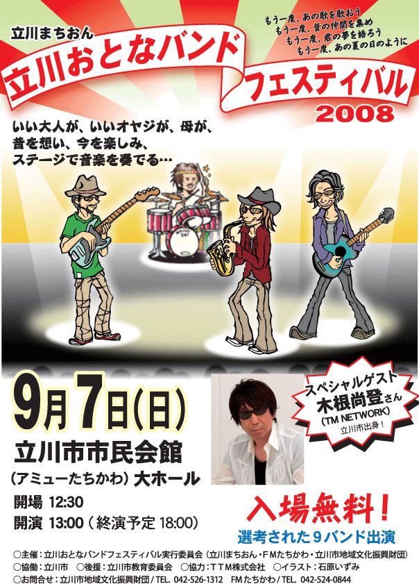 立川おとなバンドフェステイバルの ポスターができました まるこたぬの出演は2番目です FMたちかわの出演は 8/25日PM3時からです