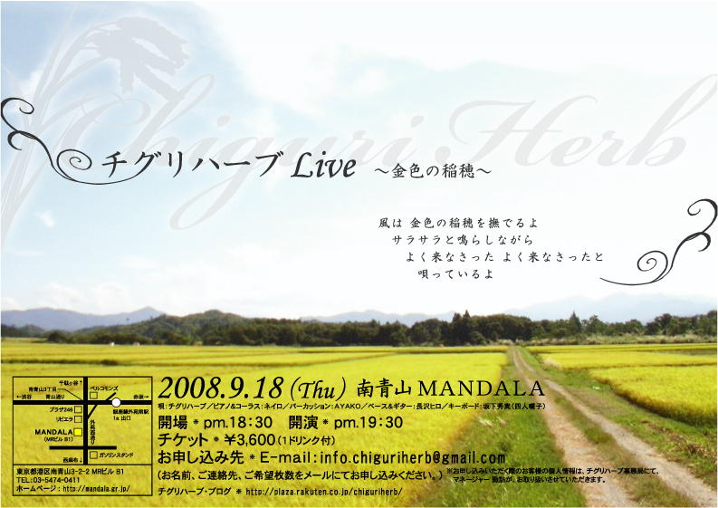 チグリハーフさんのライブが 明日9/18(木)PM18:30 より 南青山MANNDARA(チケット\3600 1ドリンク付) であります まどかまるこさんがヴァイオリンで参加します よろしくお願いいたします たぬ チグリハーフさんのブログ http://plaza.rakuten.co.jp/chiguriherb/ 南青山MANNDARA http://www.mandala.gr.jp/aoyama.html