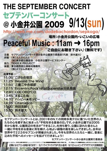 セプテンバーコンサートにまるこたぬ出演 よろしく 2009 9/13(sun) 11am~16pm 小金井公園内いこいの広場