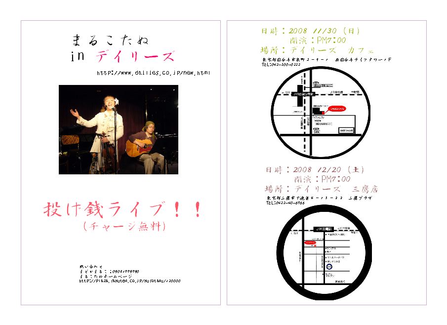 日時:2008 11/30(日) 開演:PM 7:00 場所:デイリーズ カフェ 西国分寺 http://www.dailies.co.jp/cafe.html チャージ無料 日時:2008 12/20(土) 開演:PM 7:00 場所:デイリーズ 三鷹店 http://www.dailies.co.jp/new.html チャージ無料