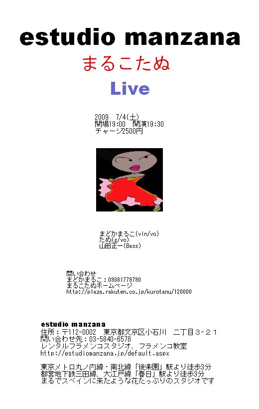 estudio manzana まるこたぬ Live 2009 7/4(土) 開場19:00 開演19:30 チャージ2500円 estudio manzana住所:〒112-0002 東京都文京区小石川 二丁目3-21 問い合わせ先:03-5840-6578 レンタルフラメンコスタジオ、フラメンコ教室 東京メトロ丸ノ内線・南北線「後楽園」駅より徒歩3分 都営地下鉄三田線、大江戸線「春日」駅より徒歩3分 まるでスペインに来たような花たっぷりのスタジオです